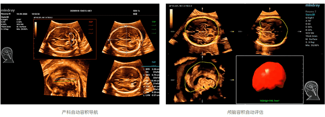 针对胎儿颅脑、面部、脊柱、长骨这类具备3D特性化的操作的临床应用场景,仁合创新开发了场景化自动容积扫描,只需“一键”即可完成自动场景识别、自动成像及优化、自动切面获取、自动定量分析,真正实现了贯穿整个检查流程的自动化工作流,降低诊断对操作者的依赖性,轻松提升病人检查效率。